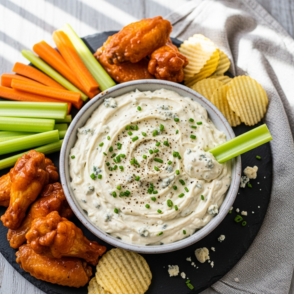 Build a Complete Spread: Pair your blue cheese dip with other appetizers like mozzarella sticks, jalapeño poppers, loaded nachos, spinach artichoke dip, and a selection of olives and pickles for an impressive game day or party spread.