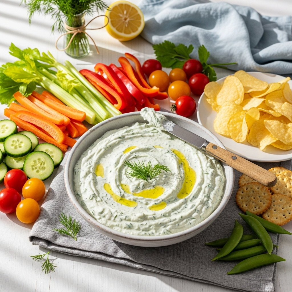 Seafood Accompaniment: This dip is exceptional with chilled shrimp, smoked salmon, crab cakes, fish sticks, or fried calamari. The cool, herby flavor complements seafood perfectly.