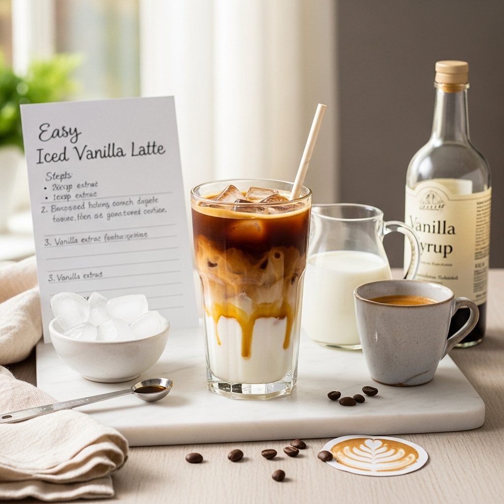 Homemade iced vanilla latte with simple ingredients—perfect for busy mornings or relaxing afternoons.
