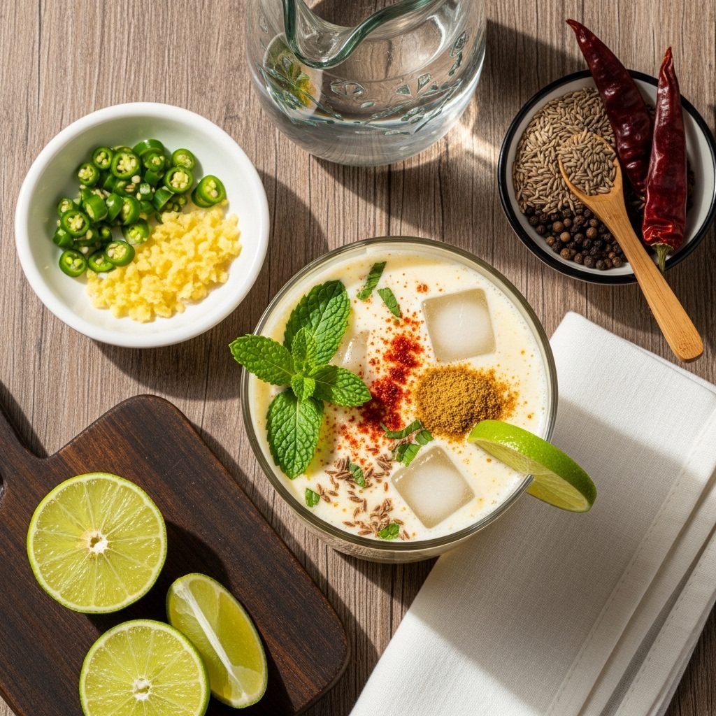 Overhead shot of yogurt, cumin powder, mint leaves, salt, and green chili on wooden table, bright natural lighting, Pinterest-style clean setup.2. Blending Shot