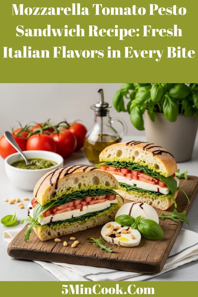 The mozzarella tomato pesto sandwich is a gloriously simple yet incredibly flavorful Italian-inspired sandwich that celebrates fresh, quality ingredients at their finest! This delicious sandwich features creamy fresh mozzarella cheese, ripe juicy tomatoes, and aromatic basil pesto, all layered between crusty bread and often finished with a drizzle of balsamic glaze. Think of it as a deconstructed Caprese salad meets pesto perfection, transformed into the ultimate handheld meal. This fresh mozzarella sandwich with pesto is perfect for so many occasions: enjoy it as a quick weeknight dinner when you don’t feel like cooking but want something satisfying, pack it for gourmet work lunches that’ll make your coworkers jealous, serve it at casual summer gatherings where fresh, light fare is appreciated, take it on picnics and outdoor adventures for portable Italian elegance, make it for Meatless Mondays when you want vegetarian options that feel indulgent, or prepare it for weekend brunches where sophisticated yet simple food shines. The beauty of this easy Italian pesto sandwich lies in its elegant simplicity—it requires no cooking beyond optional toasting, comes together in just 10 minutes, showcases the pure flavors of each high-quality ingredient, and delivers restaurant-worthy taste with minimal effort. Whether you’re a busy professional seeking quick gourmet lunches, a vegetarian looking for satisfying meatless meals, or simply someone who appreciates the fresh, vibrant flavors of Italian cuisine, this Caprese pesto sandwich delivers incredible taste, beautiful presentation, and genuine satisfaction in every single bite!
