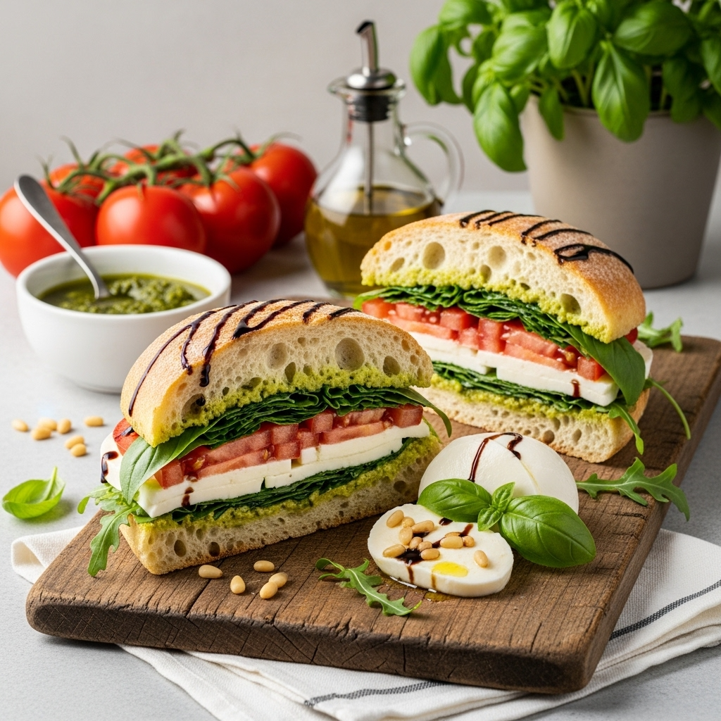 The Pesto Seal: Spreading pesto all the way to the edges of the bread serves two purposes: flavor in every bite, and creating a fat-based moisture barrier. The oils in pesto prevent tomato juice and mozzarella liquid from soaking into bread. This is why pesto sandwiches hold up better than plain Caprese sandwiches.