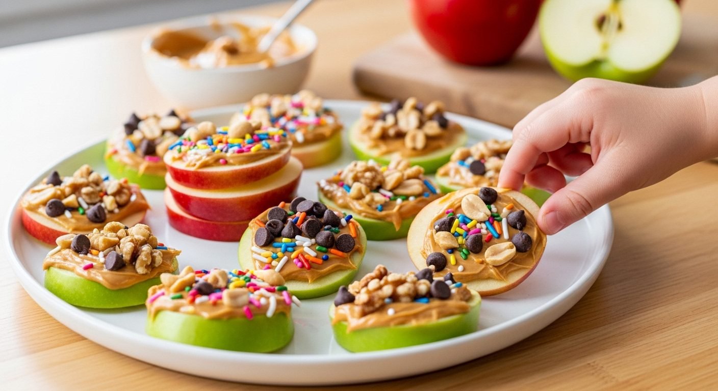 - Healthy snack idea with apples, peanut butter, and fun toppings.